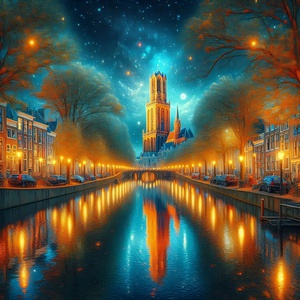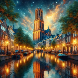 2024Utrecht Dom Tower and Canal illuminated